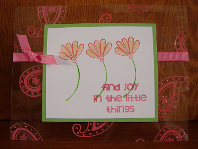 ***After looking at these cards more and more, I'm going to add some pink organdy to them between the stamped greeting and the stamped image. These cards feature a top fold (the folded edge is at the top) so the ribbon will easily go around inbetween where I stamped. If I remember I'll post a picture after I do it.